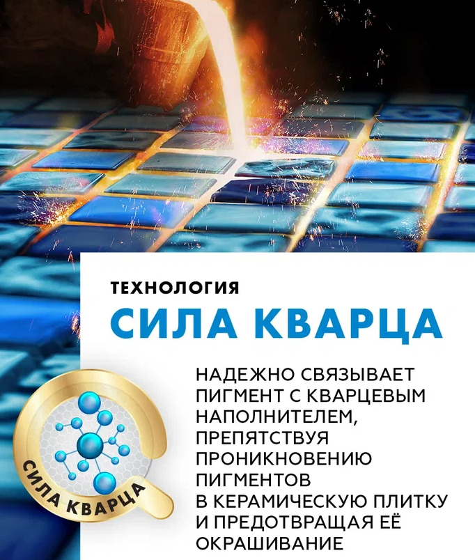 Технология "Сила кварца": Благодаря инновационной технологии, цвет затирки остается ярким и насыщенным даже спустя годы. Пигменты не мигрируют в плитку, швы не теряют свой цвет даже под солнцем или при регулярной влажной уборке.
