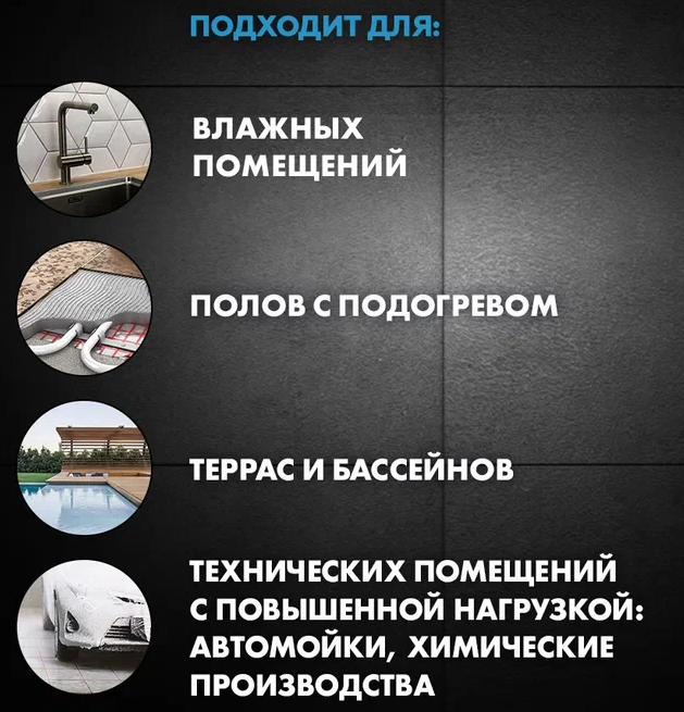 • Идеальна для мест с высокой влажностью и нагрузкой: спортивные залы, больницы, детские сады, кафе, рестораны, пищевые производства, частные дома и квартиры.