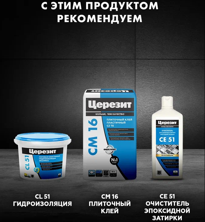 Для лучшего результата используйте эпоксидную затирку Церезит CE 89 в комплексе с другими профессиональными материалами: гидроизоляция Церезит CL 51 для защиты основания, плиточный клей Церезит CM 16 для надежной фиксации плитки и очиститель эпоксидной затирки Церезит CE 51 для легкого ухода и идеального финиша.