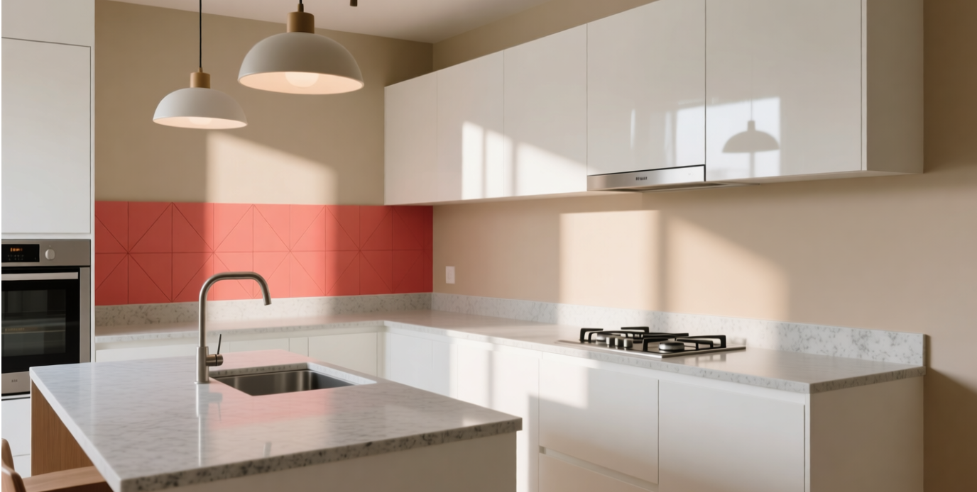 Цветовая гамма для кухни должна быть светлой и нейтральной для визуального увеличения пространства, но в рабочей зоне можно использовать яркие акценты. Важно выбирать экологически чистые краски без токсичных выделений, так как в кухне готовится пища.
