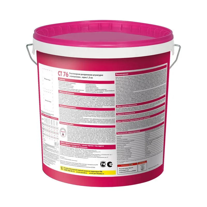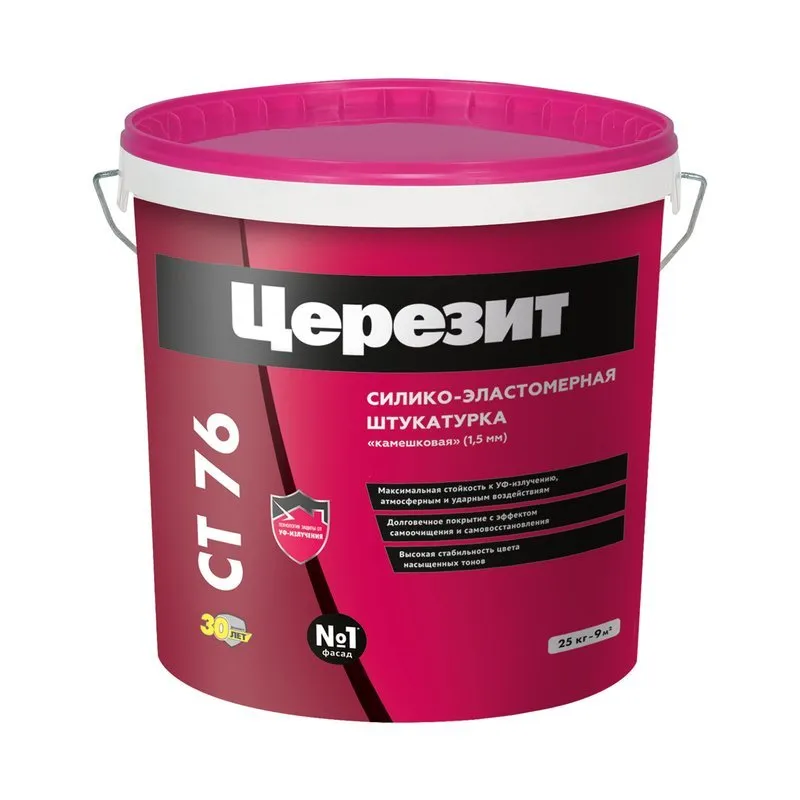 Штукатурка Церезит CT 76 предлагается в широкой гамме оттенков, с возможностью колеровки по системам Церезит Colour System и RAL. Материал обладает свойством самоочищения и способен восстанавливать мелкие трещины, что продлевает срок службы финишного слоя. Стоимость продукта составляет 7046 рублей.