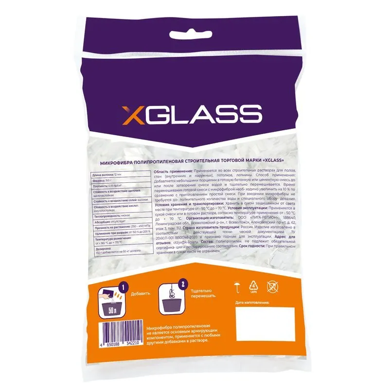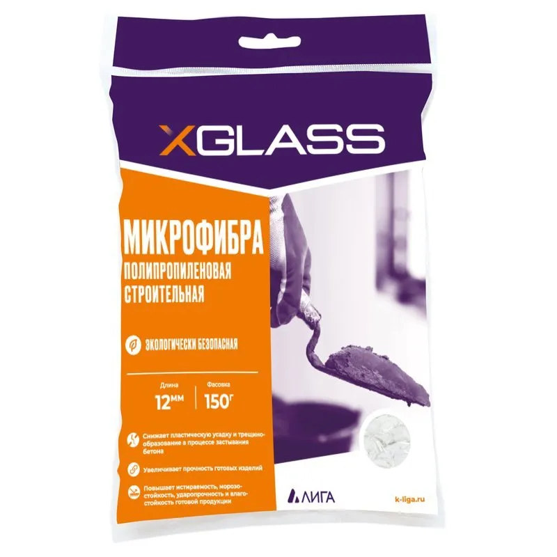 Полипропиленовая фибра X-Glass представляет собой синтетические волокна из полипропилена длиной 12 мм, предназначенные для армирования бетона и строительных растворов с целью улучшения их механических характеристик.