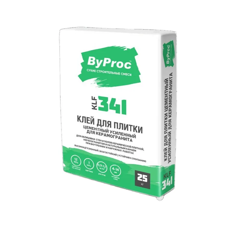 ByProc Клей усиленный KLF-341 — это цементная основа с модифицированными характеристиками, предназначенная для надежного закрепления плитки и керамогранита. Он выделяется повышенной адгезией и гибкостью, что обеспечивает его применимость в различных условиях эксплуатации.