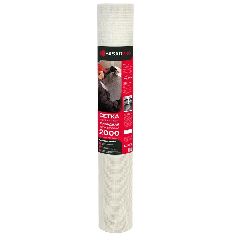 - Какие ключевые преимущества дает использование сетки FasadPro2000? Преимущества включают высокую прочность (2000 Н), устойчивость к щелочным средам и коррозии, а также удобство применения благодаря поставке в рулонах 1х50 м.
